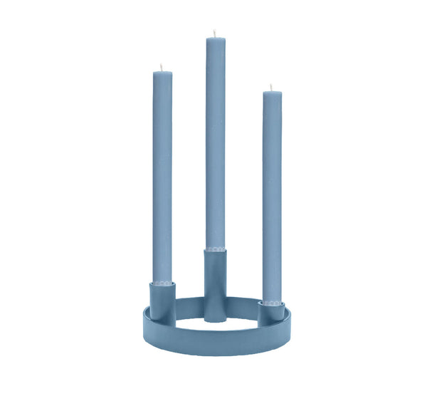A simple, round Candelabra in a perfect Pompadour Blue, designed for 3 candles, placing them at varying heights for a dramatic effect on the table.